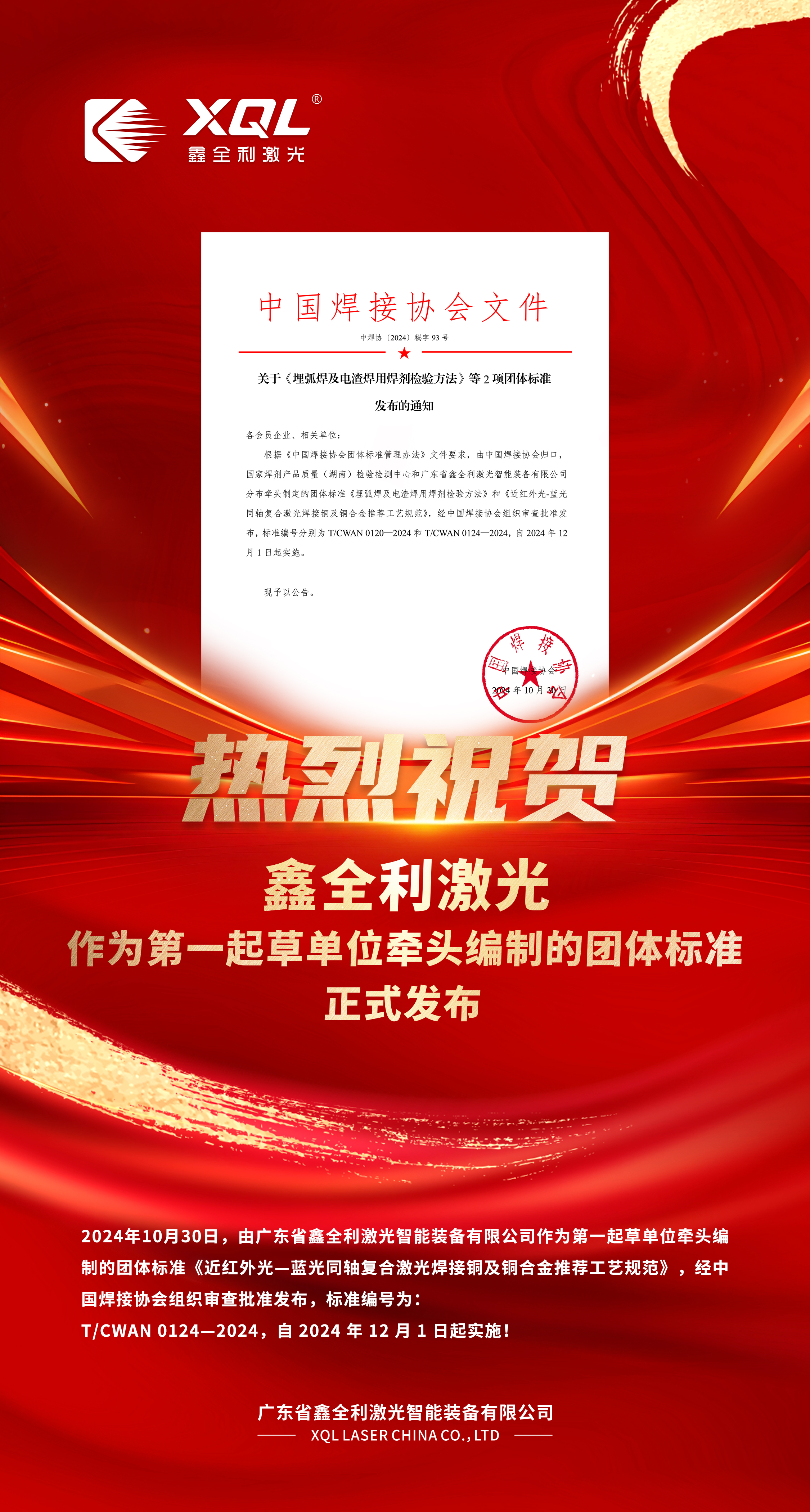 2024年10月30日 ,由廣東省鑫全利激光智能裝備有限公司作為第一起草單位牽頭編制的團體標準《近紅外光—藍光同軸復合激光焊接銅及銅合金推薦工藝規范》,經中國焊接協會組織審查批準發布,標準編號為 T/CWAN 0124—2024,自2024年12月1日起實施!該標準的制定對激光復合焊接銅及銅合金的應用具有重要指導意義,填補了復合激光焊接銅及銅合金應用標準的空白。同時,也標志著鑫全利激光標準化管理工作取得突破性進展,公司核心競爭力進一步增強。
