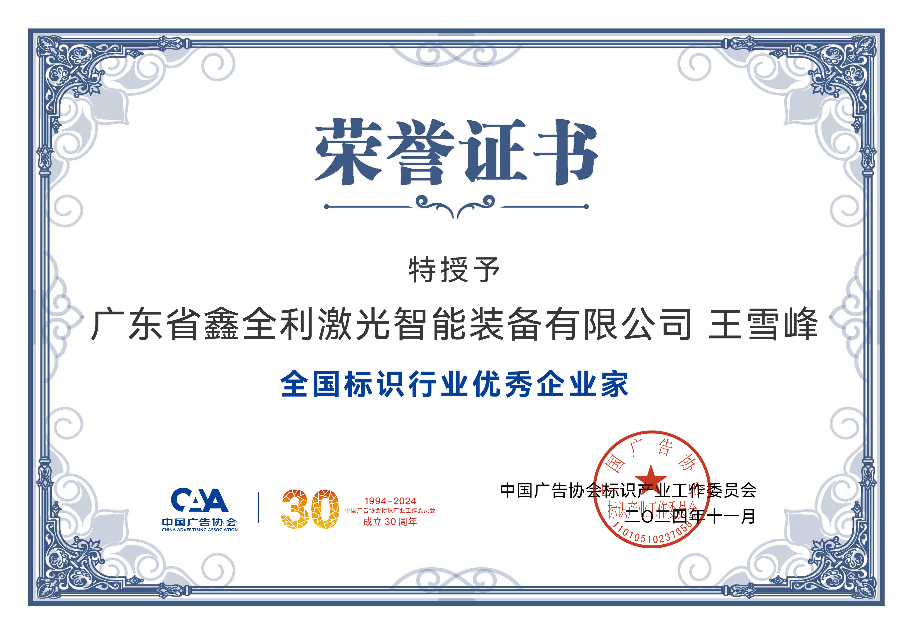 2024 年 11月 ,我司董事長王雪峰先生憑借其卓越的領導才能和對廣告標識行業發展的杰出貢獻,被中國廣告協會標識產業工作委員會授予“全國標識行業優秀企業家”稱號,為公司的發展,書寫新篇章。