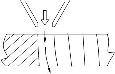d. 切割面呈斜條紋路、下半部分產(chǎn)生熔漬,并可觀察切割火花判斷切割速度快慢。火花傾斜,說明切割速度過快。