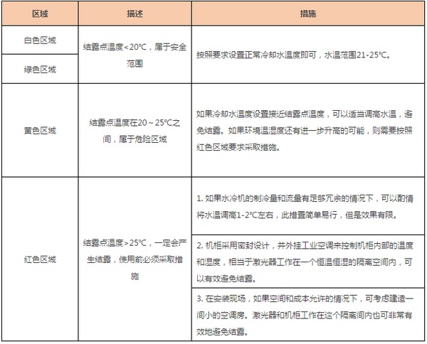 需要按照激光切割機現場(機柜)實際的溫濕度環境,設定冷卻水溫度,確保激光器冷卻水的溫度設定高于對應的結露點溫度。同時滿足激光器的水溫要求(本體溫度:21℃~25℃)及制冷需求,否則,可能造成激光器出現高溫報警。(下圖為結露點表)